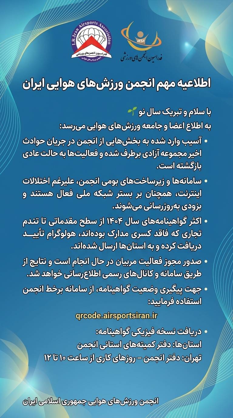 اطلاعیه مهم انجمن ورزشهای هوایی ایران انجمن ورزشهای هوایی ایران با تبریک آغاز سال نو، به اطلاع اعضا و تمامی فعالان این حوزه میرساند که پس از وقوع برخی حوادث...