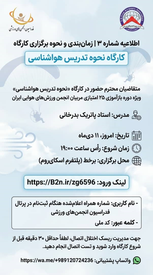 متقاضیان محترم حضور در کارگاه «نحوه تدریس هواشناسی» ویژه دوره بازآموزی ۲۵ امتیازی مربیان انجمن ورزشهای هوایی ایران